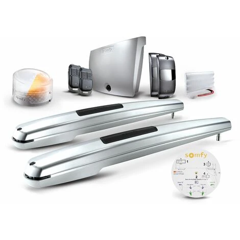 - Kit de motorisation pour portail battant incluant 2 moteurs à vérin, 1 boîtier électronique, 2 télécommandes 2 touches Keypop, 1 disque de calcul de côtes, 1 feu clignotant, 1 batterie de secours, 1 jeu de cellules photoélectriques et des pattes de fixation.