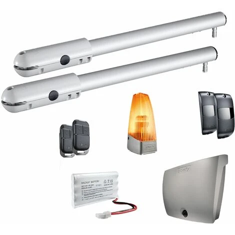 - Ce kit comprend 2 moteurs pour portail battant SGS, 2 télécommandes Keypop, 2 photocellules, 1 feu orange et 1 batterie de secours.