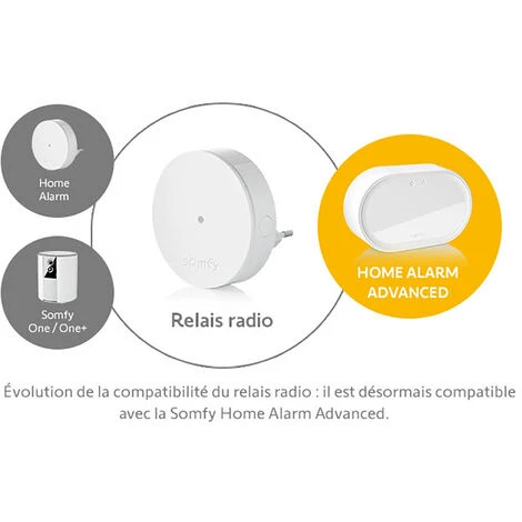 - CompatibilitĂ© : le relais radio est compatible avec les systĂšmes d’alarme Somfy Home Alarm (Advanced), Somfy One+ et la camĂ©ra Somfy One.